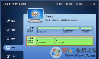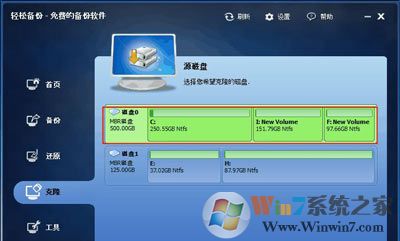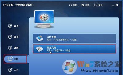 1、 下载免费的轻松备份,安装并运行。这里以克隆磁盘0到磁盘1为例。来到主页面 “克隆”栏下选择“磁盘克隆”。