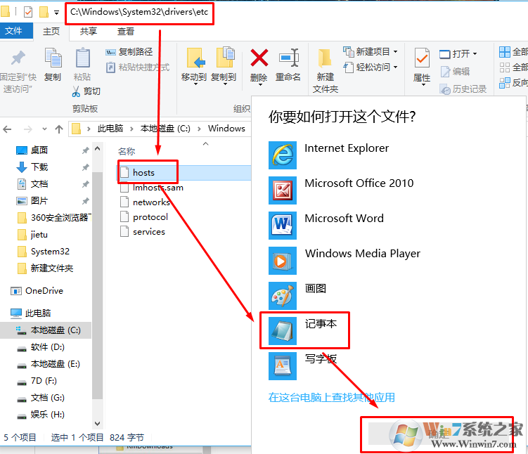 1、打开此电脑,在此电脑中依次展开:C:\Windows\System32\drivers\etc,在ect文件夹中找到hosts文件,单击右键,选择打开方式,然后选择记事本,点击确定;