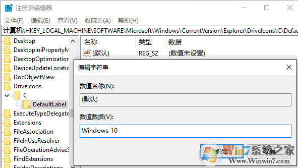 5.选中新建的DefaultLabel项,在右侧窗口中双击默认值,在弹出的编辑窗口中,把默认值的数值数据设置为想要为该磁盘分区重命名的名称,例如 Windows 10;