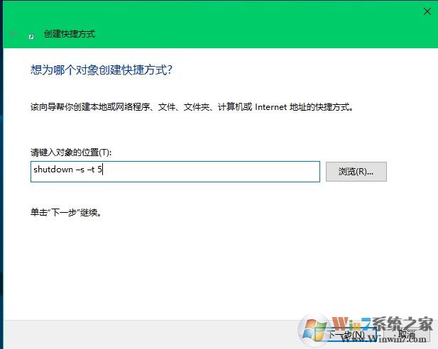 2.在创建快捷方式窗口界面中,我们在对象的位置中输入“shutdown –s –t 5”指令,然后点击“下一步”按钮,如下图所示