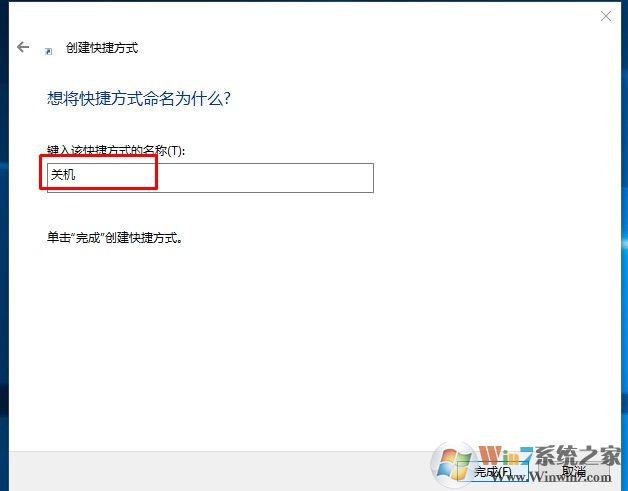 3.将快捷方式命名为自己想要的名称,建议修改为“关机”比较 一目了然,点击完成进入下一步操作。如下图所示