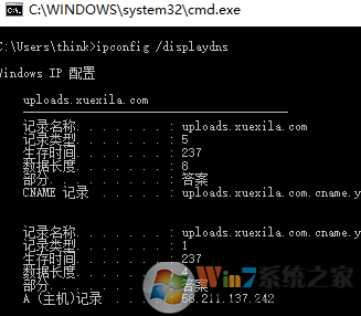 ⒉ 在命令提示符,手动输入ipconfig /displaydns并按回车执行命令。几秒钟后,就可以查看本机的DNS缓存了。