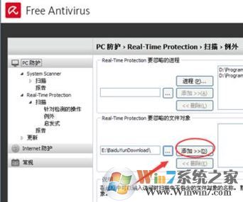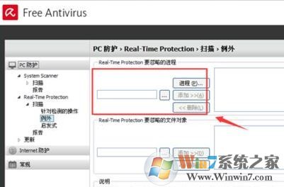 步骤3、设置进程排除列外,进入列外菜单有进程,和对象文件夹列外,如图: