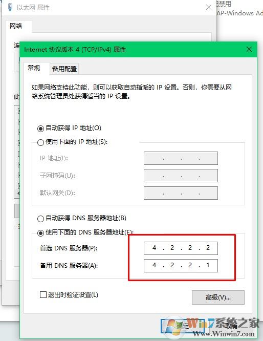 5、打开internet 本地连接,将dns服务器设置为(首选)4.2.2.2和备用4.2.2.1.