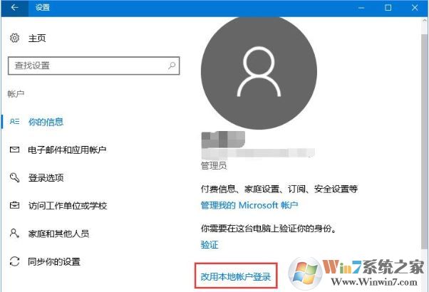 2、进入账户社会界面之后点击下图所示的“改用本地账户登录”一栏,然后进入更改界面;