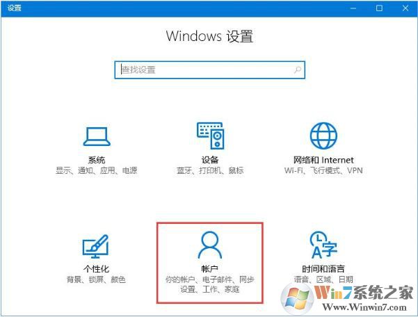 1、按下Windows+i 组合件打开Windows 设置,点击“账户(你的账户,同步设置,工作,家庭)”,进入账户设置;