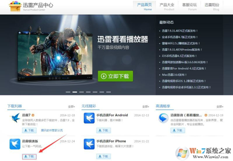 3、请登录到迅雷产品中心这个页面,下载一个迅雷极速版的安装包测试查看一下是否同样的情况进行判断是个别资源的问题还是全部资源的问题。