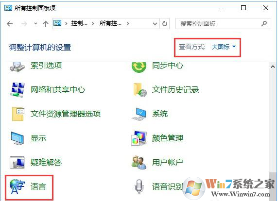 2、在下面点击【语言】(如果找不到先将右上角的查看方式改成大/小图标);