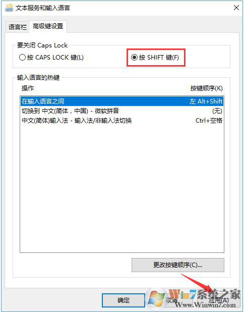 5、选择“按 shift 键”,点击“应用”即可生效。