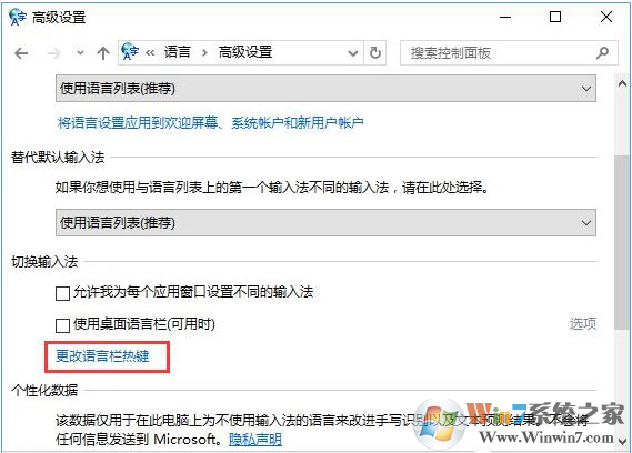 4、打开高级设置后,点击“更改语言热键”蓝色字样;