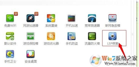 方法一..打开【360安全卫士】—【功能大全】—找到【LSP修复】 如图