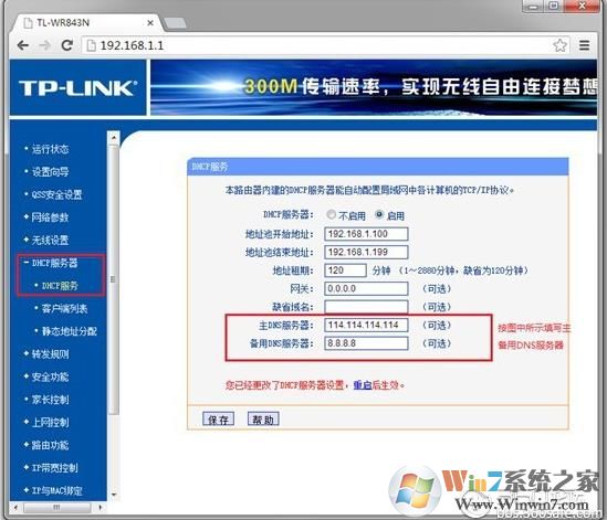 2、在“DHCP服务器—DHCP”服务中,填写主DNS服务器为114.114.114.114,备用DNS服务器为8.8.8.8,如下图所示,点击保存即可