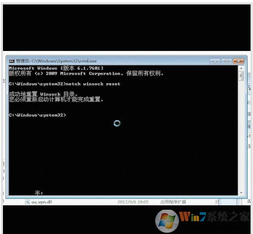 Win7用户点击开始按钮,搜索CMD,并右键以管理员身份运行,然后输入netsh winsock reset,回车