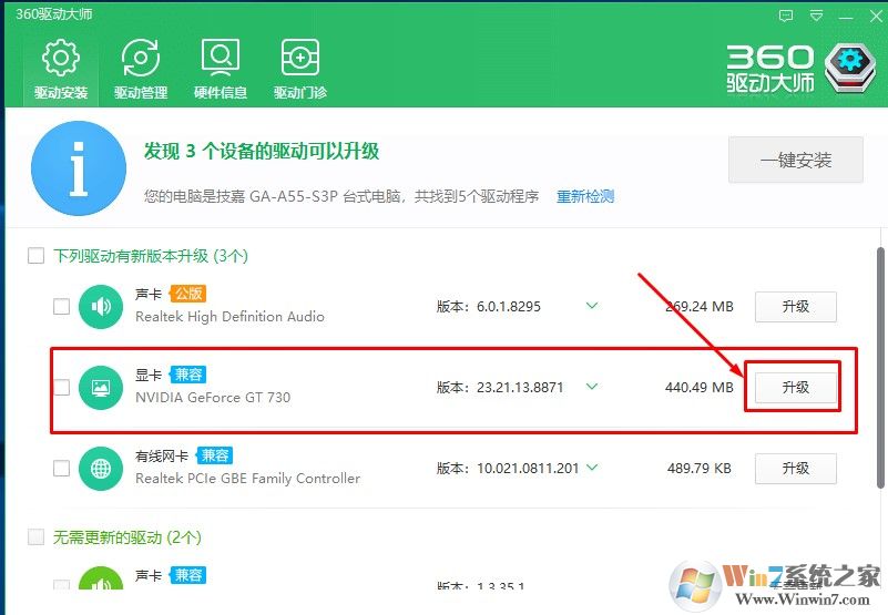 2、等待自动检测完成,然后选择显卡后面的升级等待显卡驱动下载完成之后按照提示完成安装即可。
