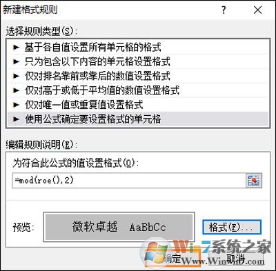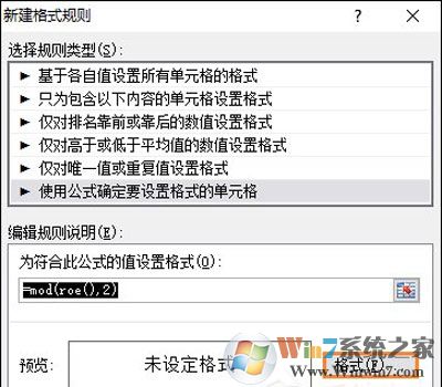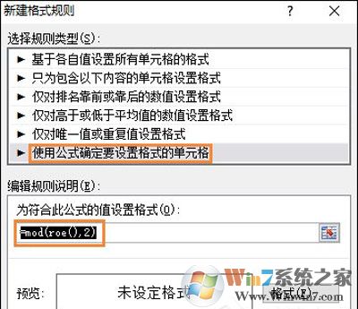 3、在弹出的窗口中选择“使用公式确定要设置格式的单元格”,在下方的公式框中输入:=mod(roe(),2) 先不要确定,也不要关闭这个窗口。