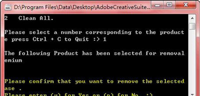 选择一种卸载模式后,Adobe CS5 Cleaner Tool会分析出所有可卸载的程序,如果确定要卸载的话,输入产品前面对应的数字序号(注意不是软件序列号),即输入数字1、并按回车继续。