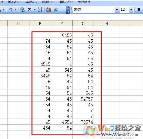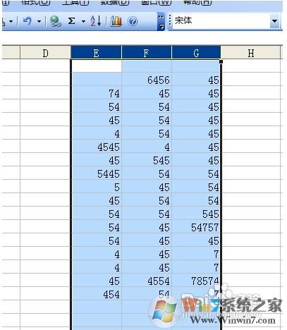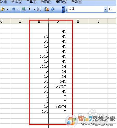 那么现在我们来取消隐藏这列数据,用鼠标选定这两列数据组,因为我们是隐藏的中间一列,所以要将其两边的E与G列都选择起来。如图所示。