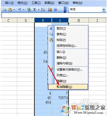 选择完成后点击鼠标右键,然后会在右键菜单中出现一个取消隐藏的选项,我们选择此选项后此F列便会重新出现了。如图。