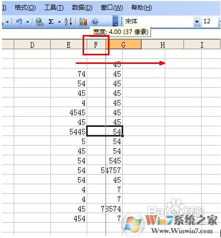 其实我们想要取消隐藏还有另外的一种简单的方法。就是在E与G列数据之间的那条分界线,我们可以将鼠标移动到此分界线的右侧,当鼠标变成了一个可移动的图标时,我们可以拖动鼠标向右,如图所示。