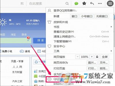 2、打开后,从菜单中找到并选择“QQ浏览器设置”这一项,打开它。