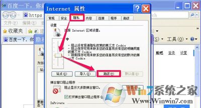 6、进入Internet选项的“隐私”选项卡,在网站级别上设置为“中”,然后点击“高级”按钮。