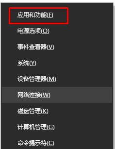 1、在开始菜单上单击鼠标右键,选择【应用和功能】;