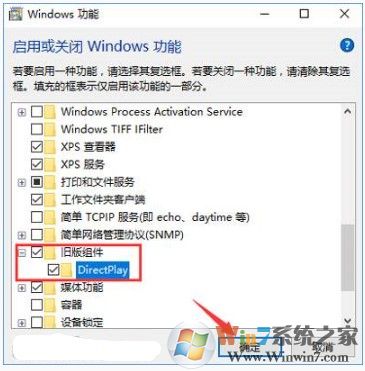 2、找到DirectPlay 前面点勾,点击确定,然后确定,重启电脑即可。