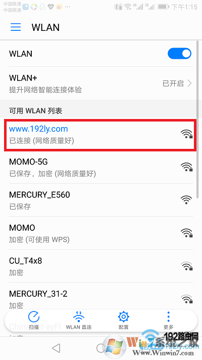 如下图所示,鸿哥自己这台路由器的wifi名称是:www.192ly.com;我在用手机修改它的wifi密码之前,手机需要先连接到这个wifi信号。