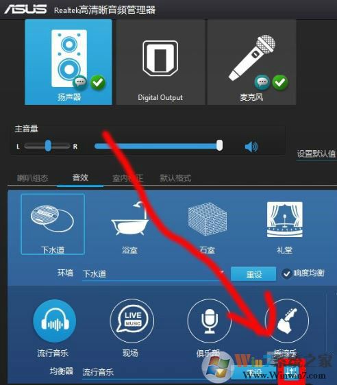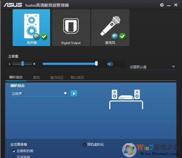 2、打开声音管理器,可以看到扬声器有四个选项:喇叭组态、音效、室内矫正、默认格式;