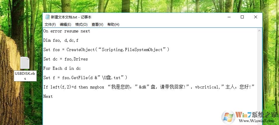 1、新建记事本文档,在记事本中输入以下代码,并将它命名为USBDISK.vbs.,存在C盘的根目录。