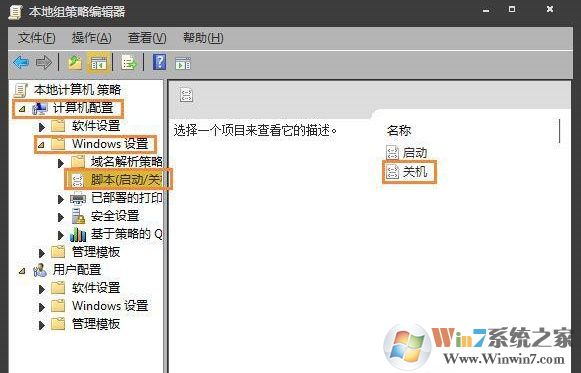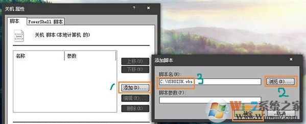 2、win10系统点击“开始—运行”,输入“gpedit.msc”,按回车键,打开组策略编辑器。依次展开“计算机配置—Windows设置—脚本(启动/关机)”, 双击打开“关机”项,再点击“添加”,选择添加前面保存在C盘的USBDISK.vbs文件,确定后退出组策略编辑器。