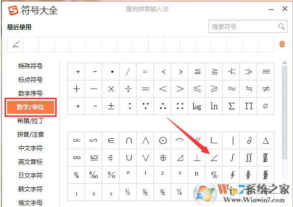 3、然后在数学/单元选项里面,可以找到角度符号∠,点击就可以输入了,如图所示。