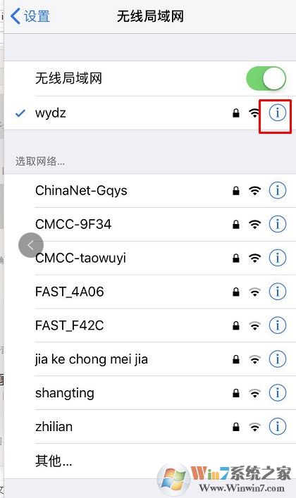 4、接着在右窗格中可以看到当前 iPad 连接的无线网络,请点击右侧的叹号图标,