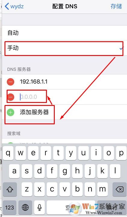 6、见过nds选择为手动,然后点击添加。接下来在 DNS 中输入 8.8.8.8 或 114.114.114.114 地址,再点击顶部的“无线局域网”返回,