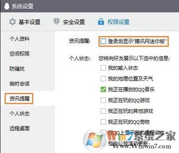 3、在系统设置左侧列表就可以看到“资讯提醒”这四个字,鼠标点击就可以在右侧出现对应的,我们要关闭的腾讯网迷你版的去除复选框,点击将勾勾去除保存就可以了。