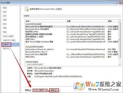 3、进入WORD选项后点击【加载项】然后在管理那个位置选项【COM加载项】点击转到。