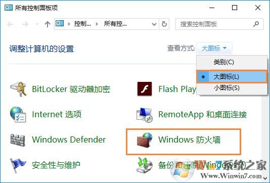 1、打开控制面板,将查看方式修改为【大图标】,在下面点击【Windows 防火墙】即可进行详细设置,如图所示: