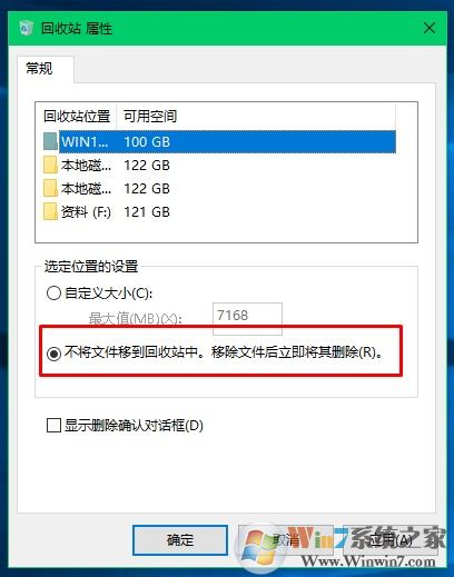 2、将”不将文件移动到回收站中,移除文件后立即将其删除取消选择即可。