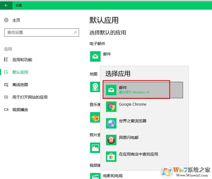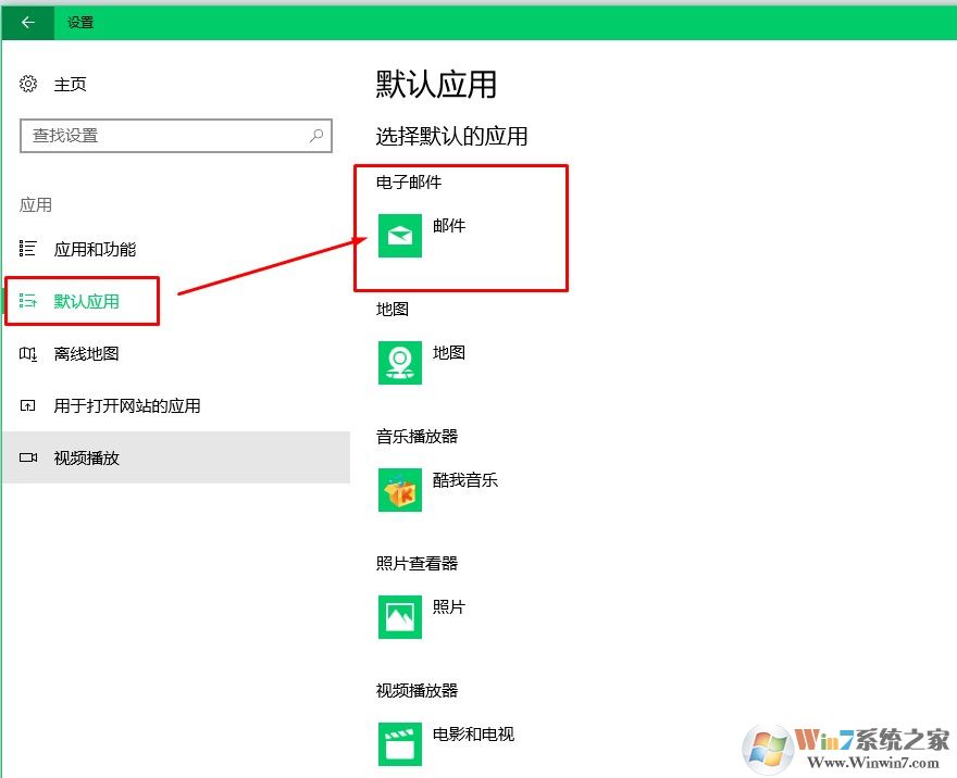 3、查看默认应用下电子邮件默认应用是否被设置为邮件或者自己安装的电子邮件软件。