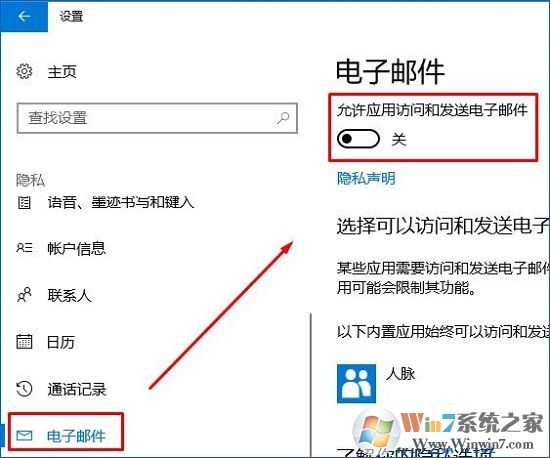 3、在左侧移动到下面些,找到并点击电子邮件,将“允许应用访问和发送邮件”和人脉,取消勾选,重启计算机,查看是否还有类似现象出现。