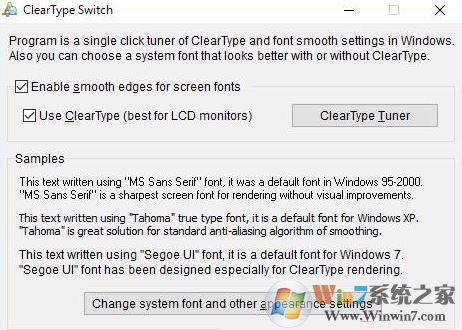 只需勾选“Enable smooth edges of screen fonts”,即可在下面的“Samples”预览区域看到字体的变化,字体的边缘变得平滑许多,清晰感也有所增强。最后点击“ClearType Tuner”即可开启ClearType平滑效果。反之,如果想要关闭ClearType,只需取消勾选“Enable smooth edges of screen fonts”即可,如下图所示: