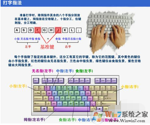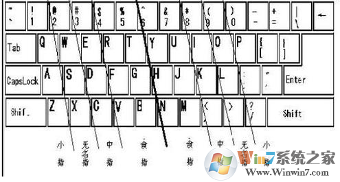 所谓标准指法就是把你的双手依照下图的位置放在键盘上,即让你的左手食指放在字母F上(F键上有一个小突起,我们通常称之为盲打坐标),右手食指放在字母J上(J键也有一个盲打坐标)然后将四指并列对齐分别放在相邻的键钮上。