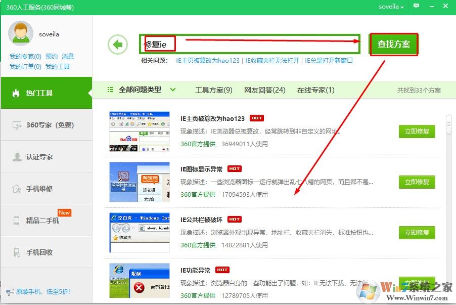 2、在搜索栏中输入修复ie或者自己相应的问题我们就可以找到相关问题的解决方法了,然后点击立即修复即可。