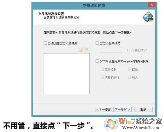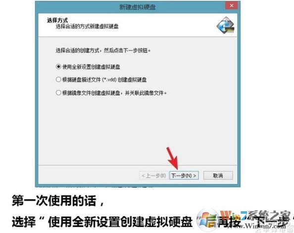 4、使用全新的设置创建虚拟硬盘,点下一步;