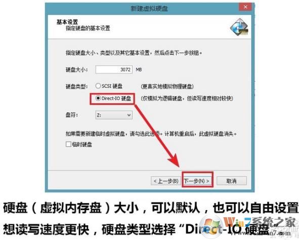 5、硬盘的大小可以默认,也可以自由设置,总之要留内存给系统用~想读写速度快,那么选择 direct-io 硬盘
