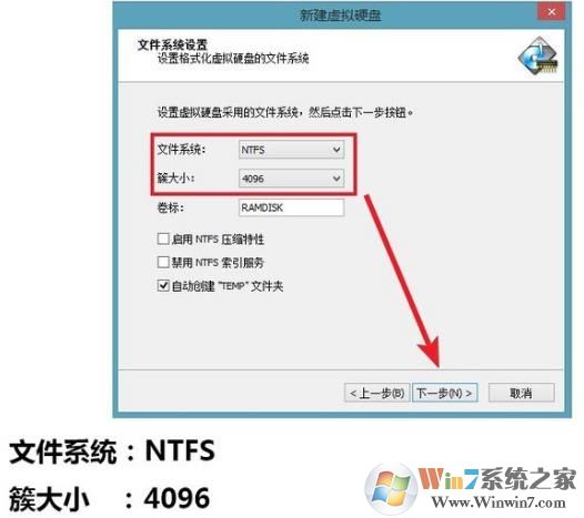 7、文件系统ntfs 簇的大小 4096 如下图,再点下一步;