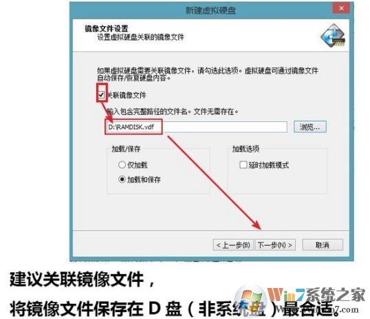 9、把镜像放在哪里,关联镜像文件 并制定一个位置放虚拟磁盘文件,下面选“加载和保存”;然后点下一步