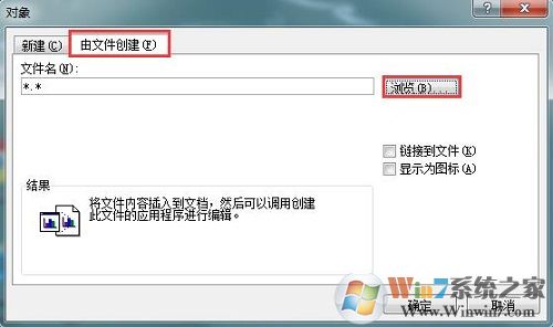 3、在对象对话框中点击“由文件创建”,然后点“浏览”,找到刚刚保存的Excel文件,点击“插入”,再点“确定”。