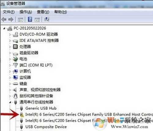 5、进入设备管理器,找到鼠标和其他指针设备以及通用串行总线控制器,点击旁边的箭头,查看是否有出现黄色感叹号的标志 ,如果有就将其更新