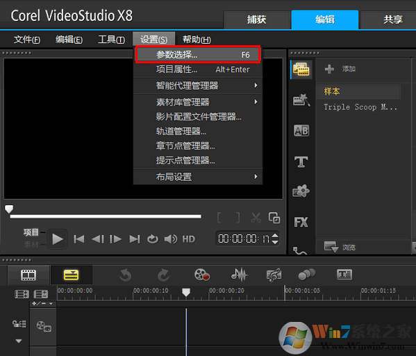 1、首先,启动会声会影后,用鼠标点击菜单“设置”-“参数选择”。